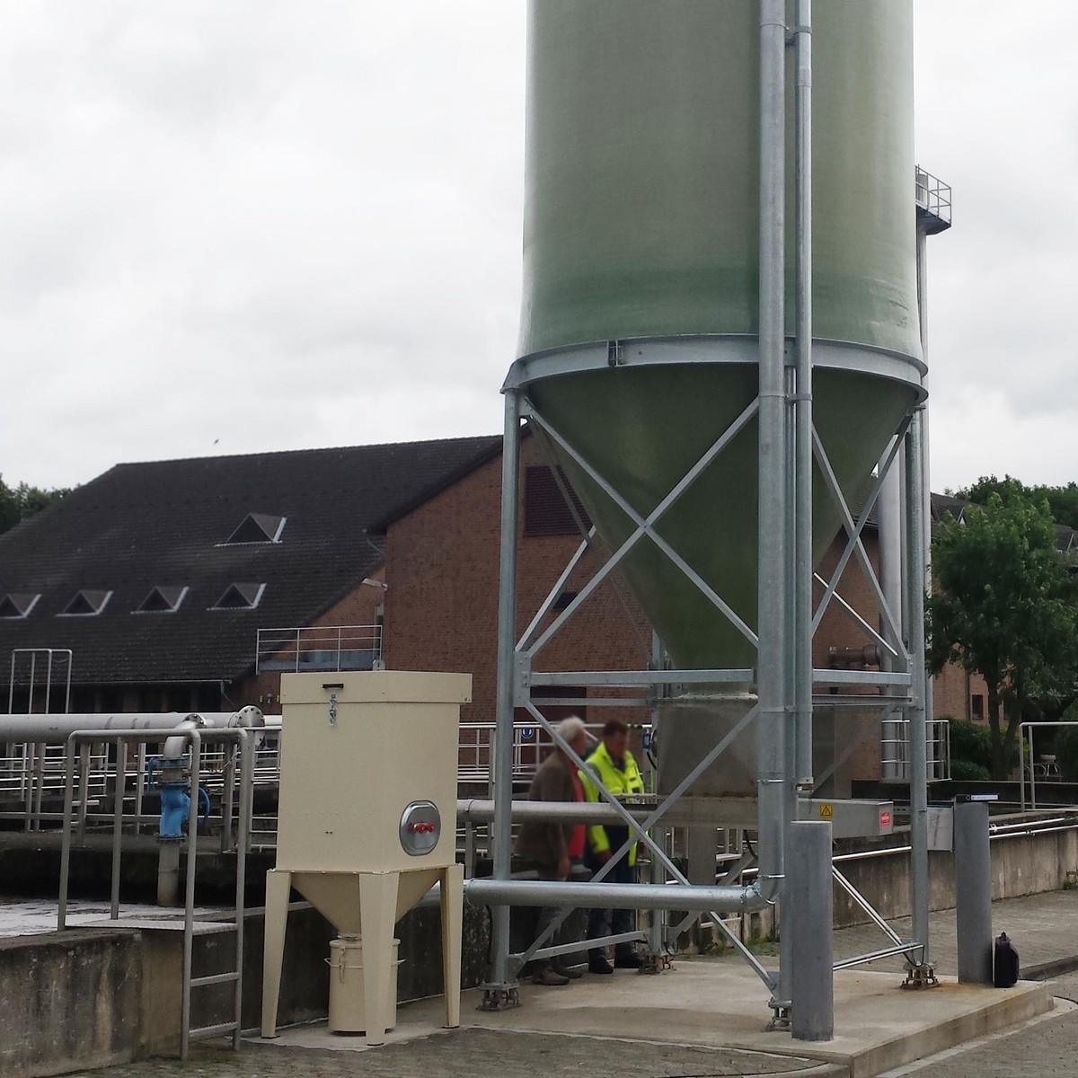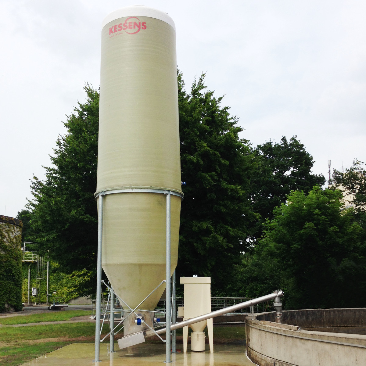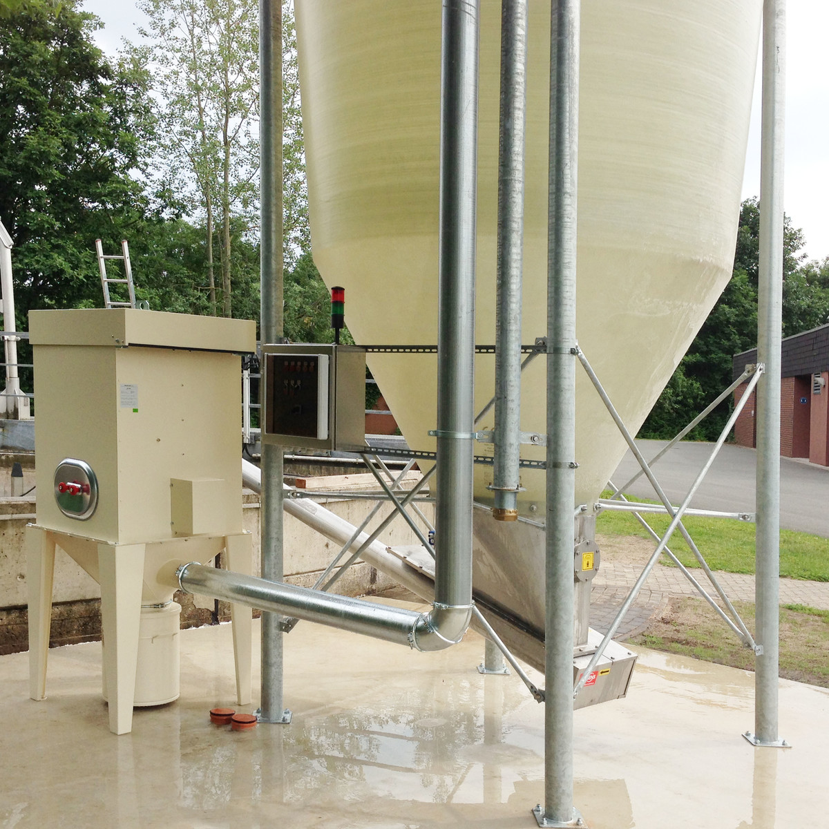 Dry Dosing Systems Dry Dosing System – 31 m³ Silo 31 m³ Silo with exhaust air filter and Ø150 mm stainless steel discharge screw with shut-off valveØ150 mm stainless steel dosing screw with shut-off valve, exhaust air filterØ150 mm exhaust air duct, exhaust air filter, Ø102 mm filling line, electrical control with signal lampOutlet with electric shut-off valve and Ø150 mm cleaning opening Dry Dosing System in Belgium – 31 m³ Silo with climbing ladder 31 m³ GRP Silo with climbing ladder and platform on the silo roofSilo and exhaust air filterØ150 mm stainless steel dosing screwØ150 mm discharge system with electromotive shut-off valve, stainless steel pipe with inspection hatch Dry Dosing System – 50 m³ Silo with weighing system 50 m³ GRP Silo with weighing systemOutlet with cleaning opening and Ø150 mm discharge pipeFully automatic control with signal light, load cells, Ø150 mm stainless steel dosing screwTouch panel for system control and evaluation Dry Dosing System – 70 m³ Silo 70 m³ GRP Silo with exhaust air filter and Ø150 mm dosing screw with shut-off valveØ150 mm stainless steel dosing screw with shut-off valveFully automatic control with signal light, Ø102 mm filling line and Ø150 mm ventilation lineExhaust air filter for collecting dust during the filling process Two Dry Dosing Systems – 20 m³ Silos Two Dry Dosing Systems, 20 m³ Silos in special colorFully automatic control with signal lamp, Ø150 mm dosing screw and shut-off valve