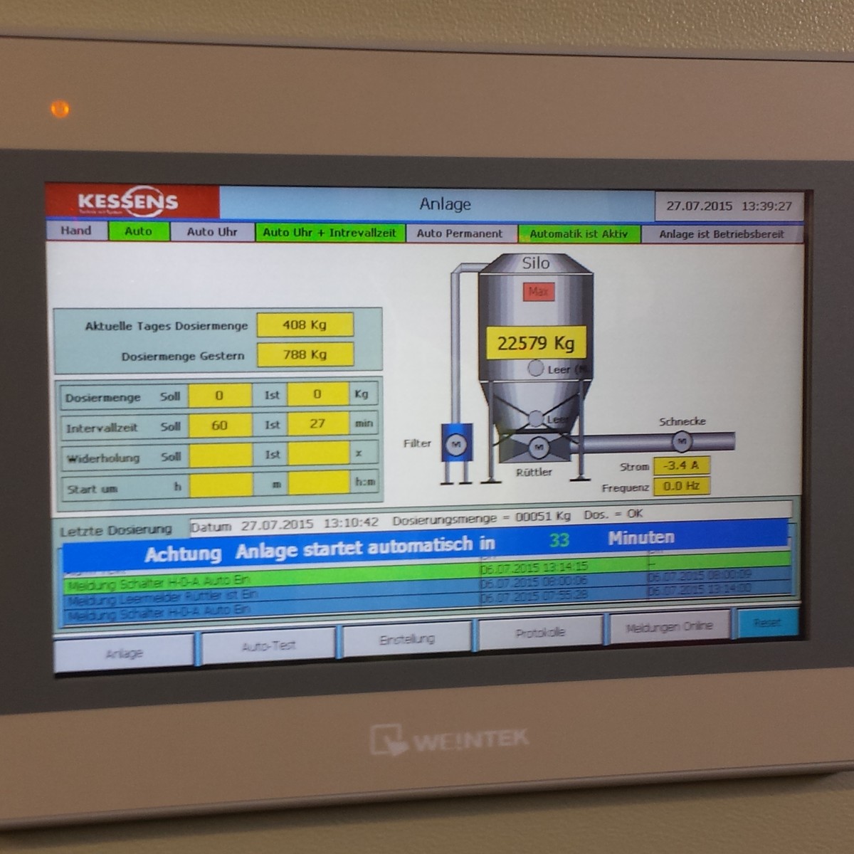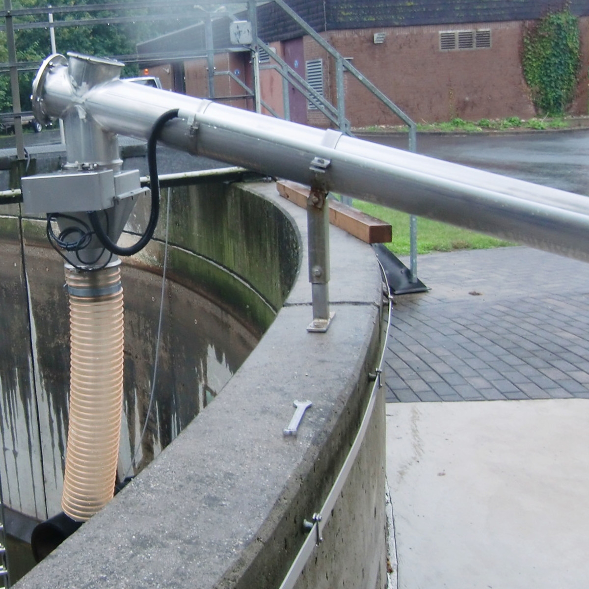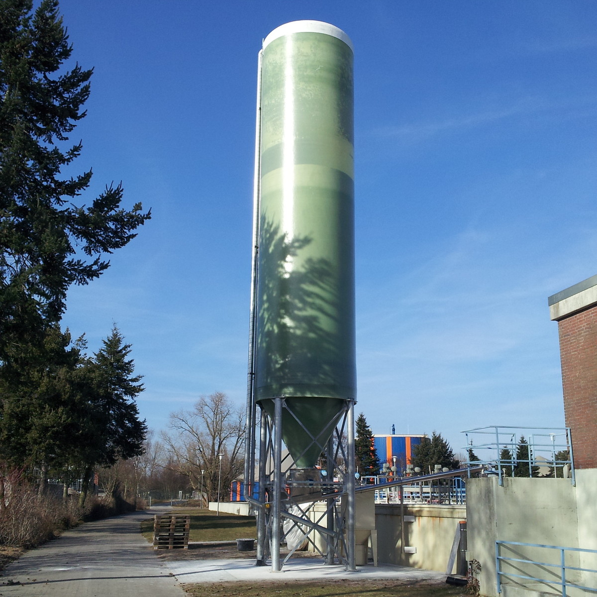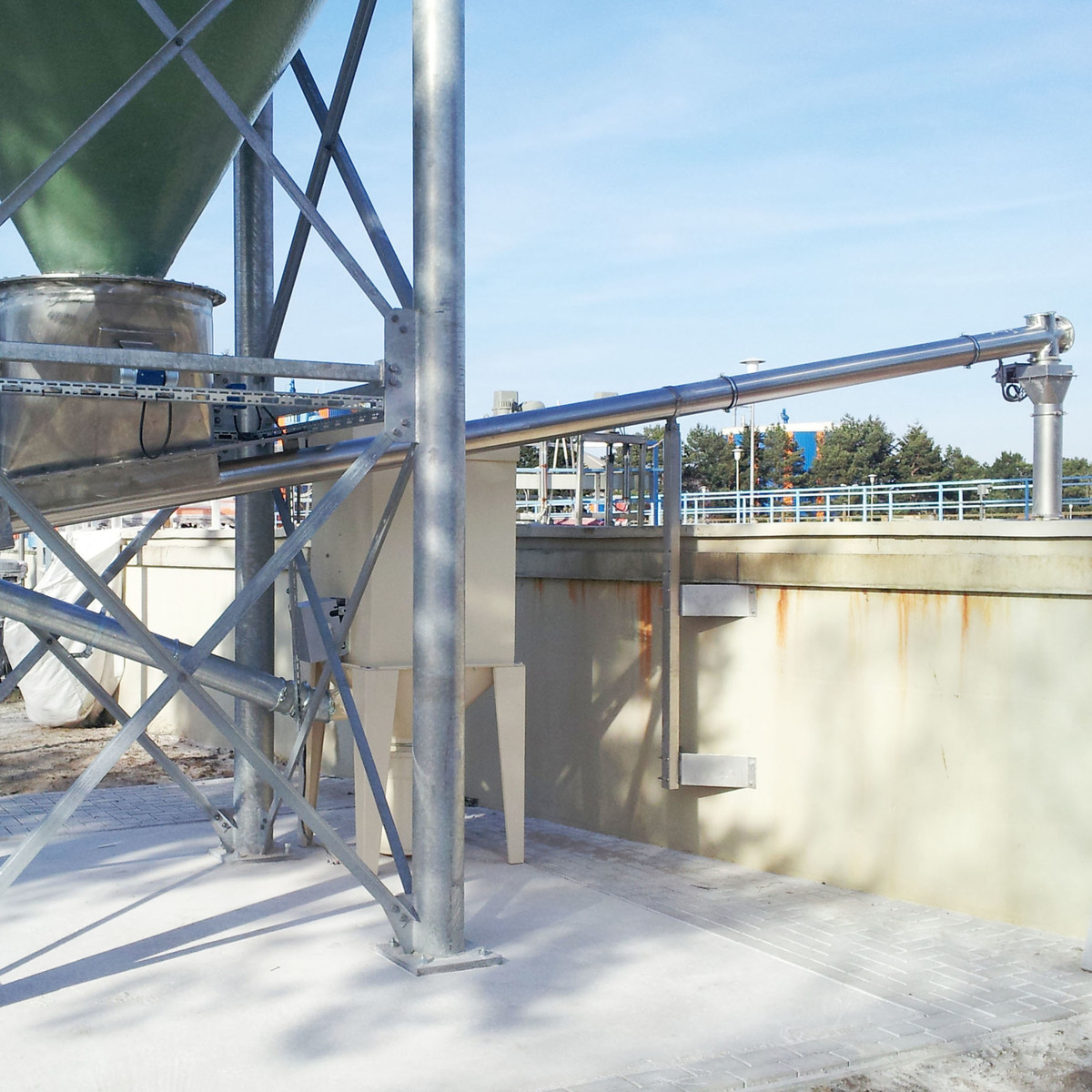 Dry Dosing Systems Dry Dosing System – 31 m³ Silo 31 m³ Silo with exhaust air filter and Ø150 mm stainless steel discharge screw with shut-off valveØ150 mm stainless steel dosing screw with shut-off valve, exhaust air filterØ150 mm exhaust air duct, exhaust air filter, Ø102 mm filling line, electrical control with signal lampOutlet with electric shut-off valve and Ø150 mm cleaning opening Dry Dosing System in Belgium – 31 m³ Silo with climbing ladder 31 m³ GRP Silo with climbing ladder and platform on the silo roofSilo and exhaust air filterØ150 mm stainless steel dosing screwØ150 mm discharge system with electromotive shut-off valve, stainless steel pipe with inspection hatch Dry Dosing System – 50 m³ Silo with weighing system 50 m³ GRP Silo with weighing systemOutlet with cleaning opening and Ø150 mm discharge pipeFully automatic control with signal light, load cells, Ø150 mm stainless steel dosing screwTouch panel for system control and evaluation Dry Dosing System – 70 m³ Silo 70 m³ GRP Silo with exhaust air filter and Ø150 mm dosing screw with shut-off valveØ150 mm stainless steel dosing screw with shut-off valveFully automatic control with signal light, Ø102 mm filling line and Ø150 mm ventilation lineExhaust air filter for collecting dust during the filling process Two Dry Dosing Systems – 20 m³ Silos Two Dry Dosing Systems, 20 m³ Silos in special colorFully automatic control with signal lamp, Ø150 mm dosing screw and shut-off valve